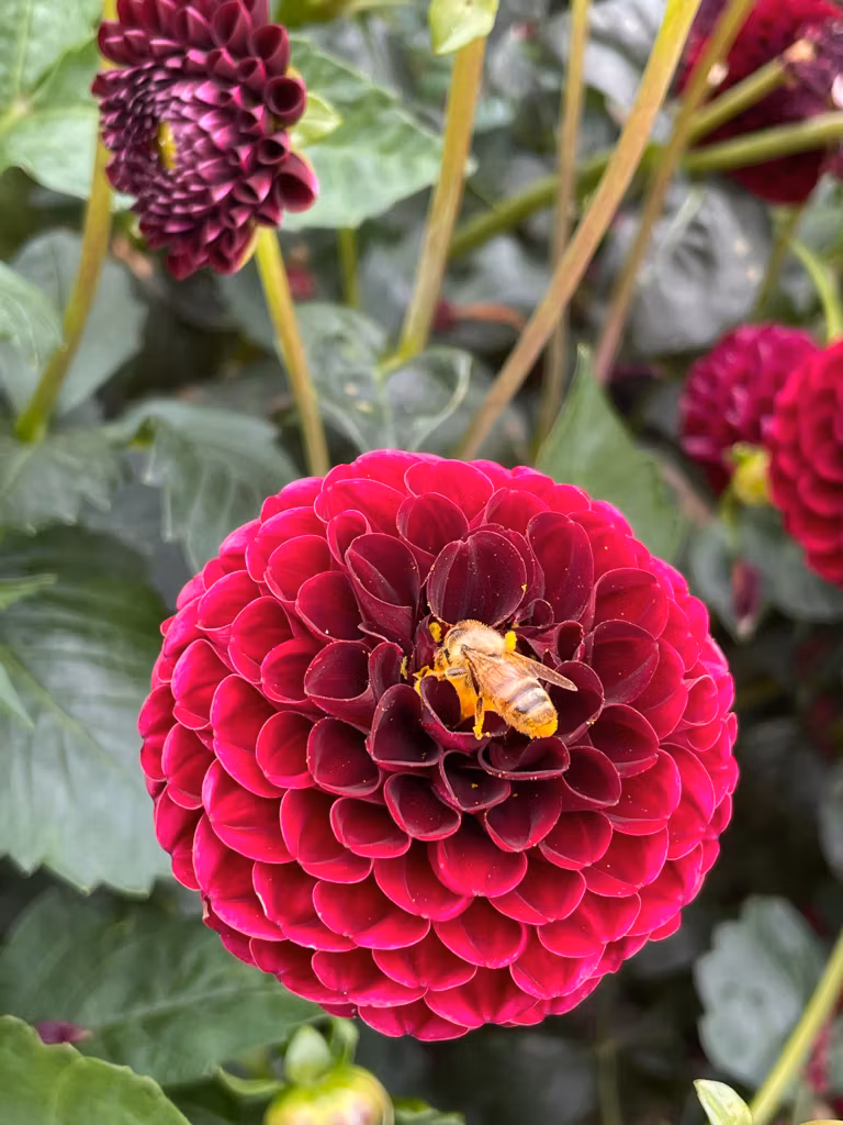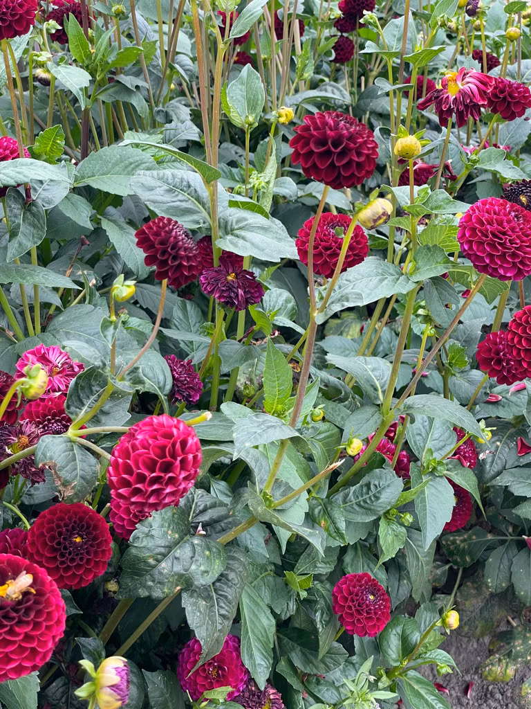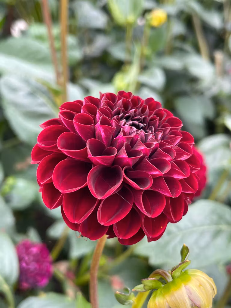 En tjusig pompondahlia med små söta mörkröda perfekt bollformade blommor. Upplevs nästan sammetssvart ibland. Riklig blomning! Mycket bra som snittblomma då den står sig länge. Blommorna blir cirka 6 cm stora och plantan cirka 110 cm hög. Mörkgrönt bladverk.